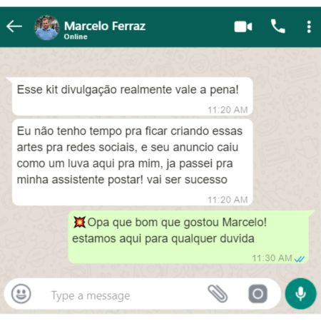 Valeu cada centavo! As artes e vídeos são muito profissionais e ajudaram a atrair novos clientes para o meu negócio. O melhor de tudo? Chegou rapidinho no meu WhatsApp e e-mail! Super satisfeito